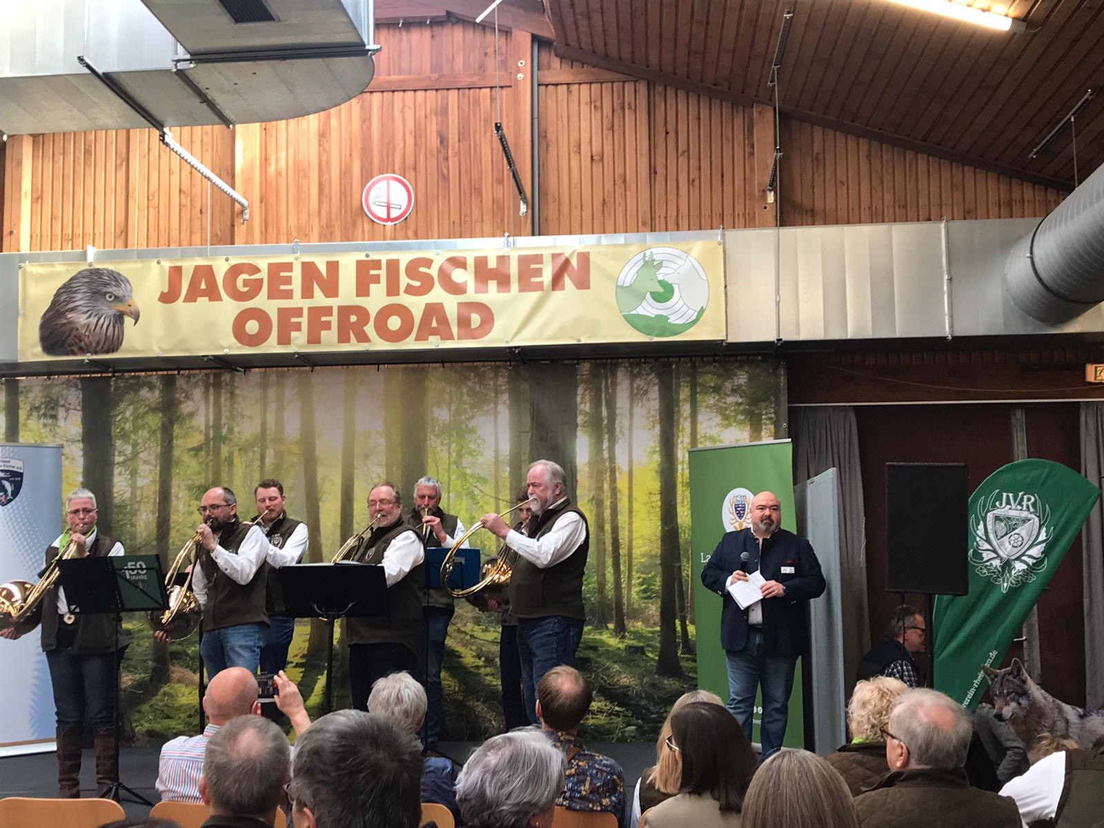 Pünktlich um 12:00 Uhr begann unser Auftritt zunächst mit unserer starken gemischten Gruppe mit den Signalen „Sammeln der Jäger“ und „Begrüßung“. Weiter ging es unter der Moderation von Herrn André Klaholz mit Märschen zu Ehren der Treiber, Jäger und Hunde. Durch interessante Konversation des Moderators und unseres Hornmeisters zwischen den Stücken stellte sich der Auftritt sehr kurzweilig dar.